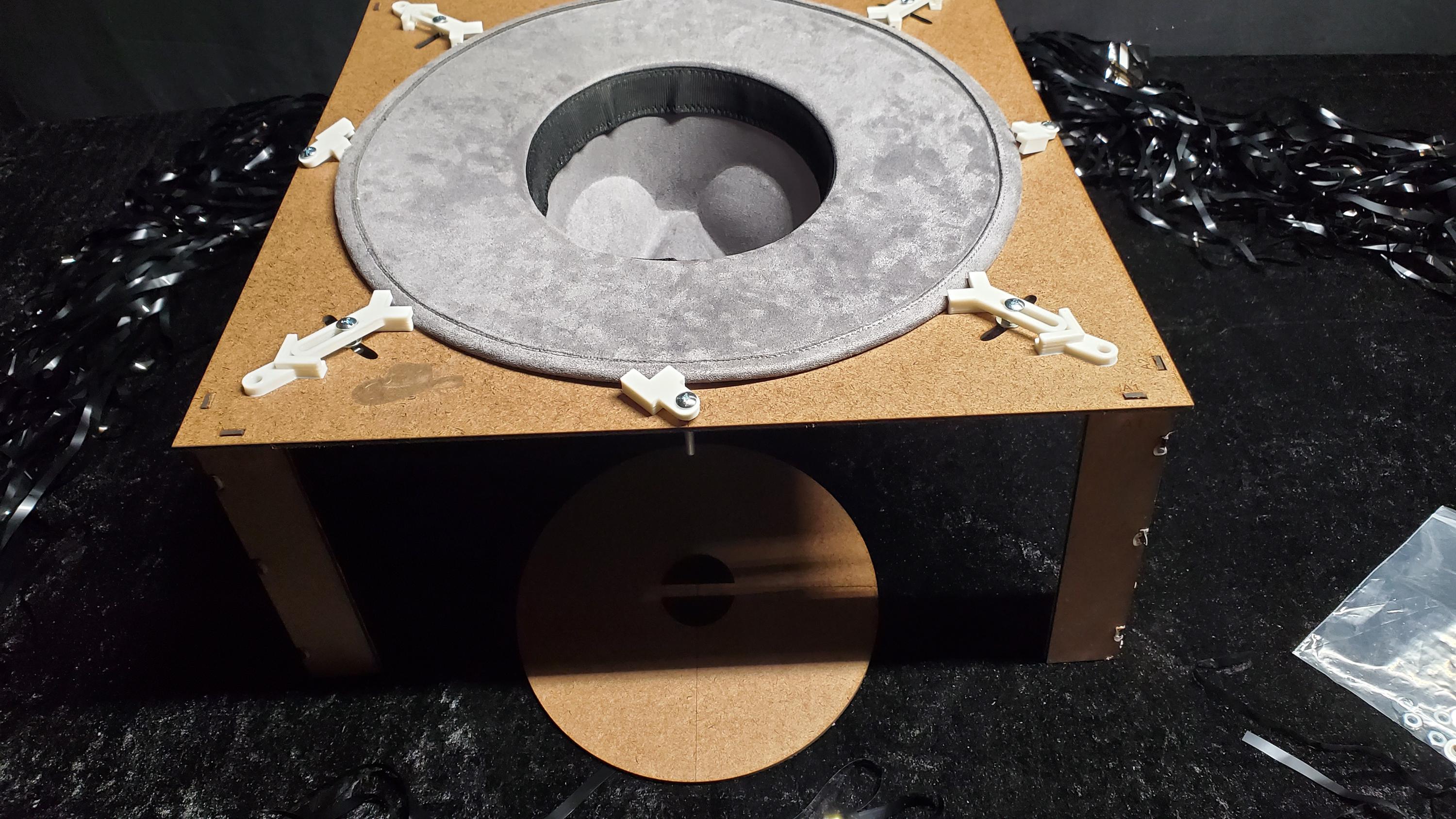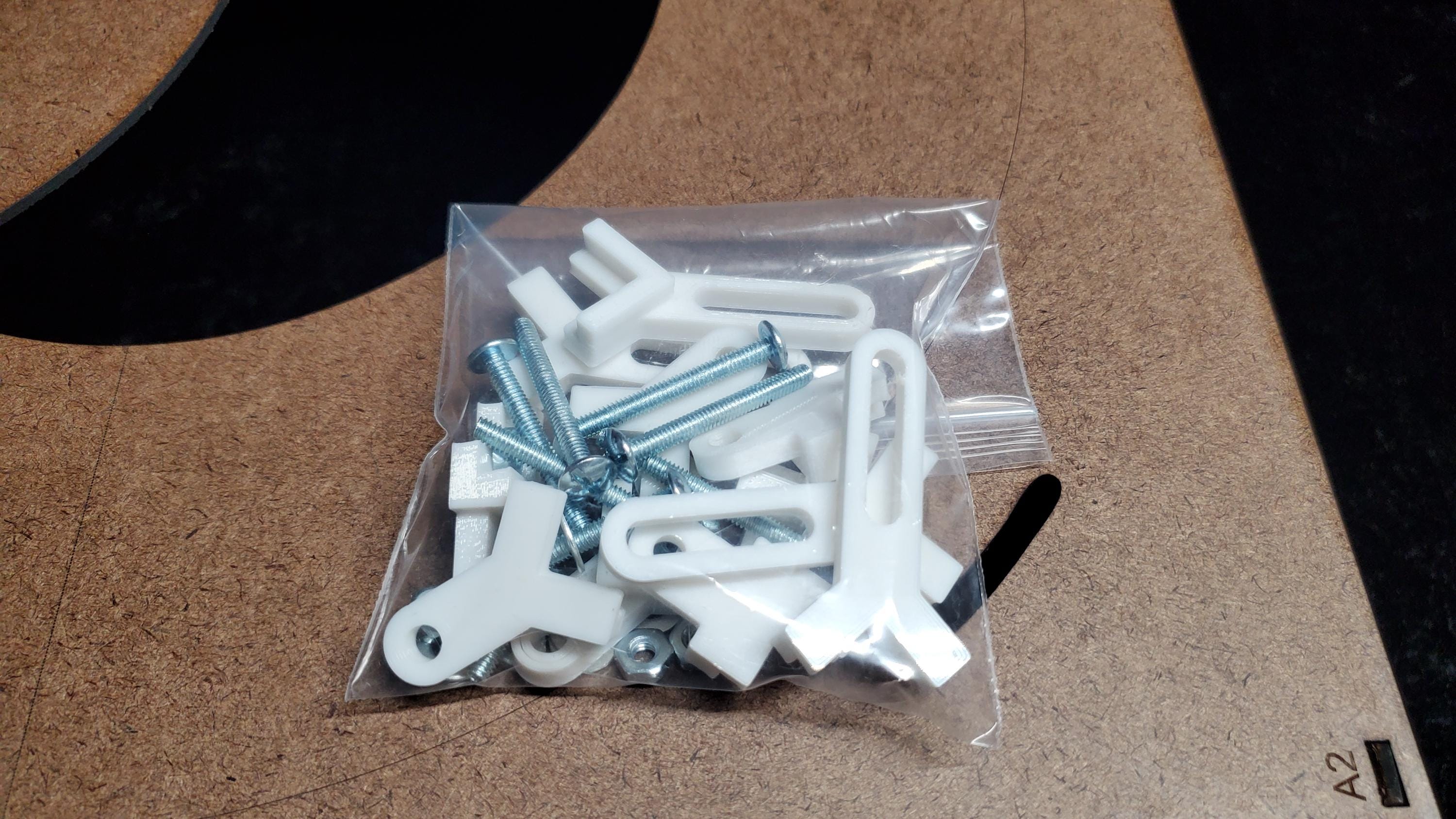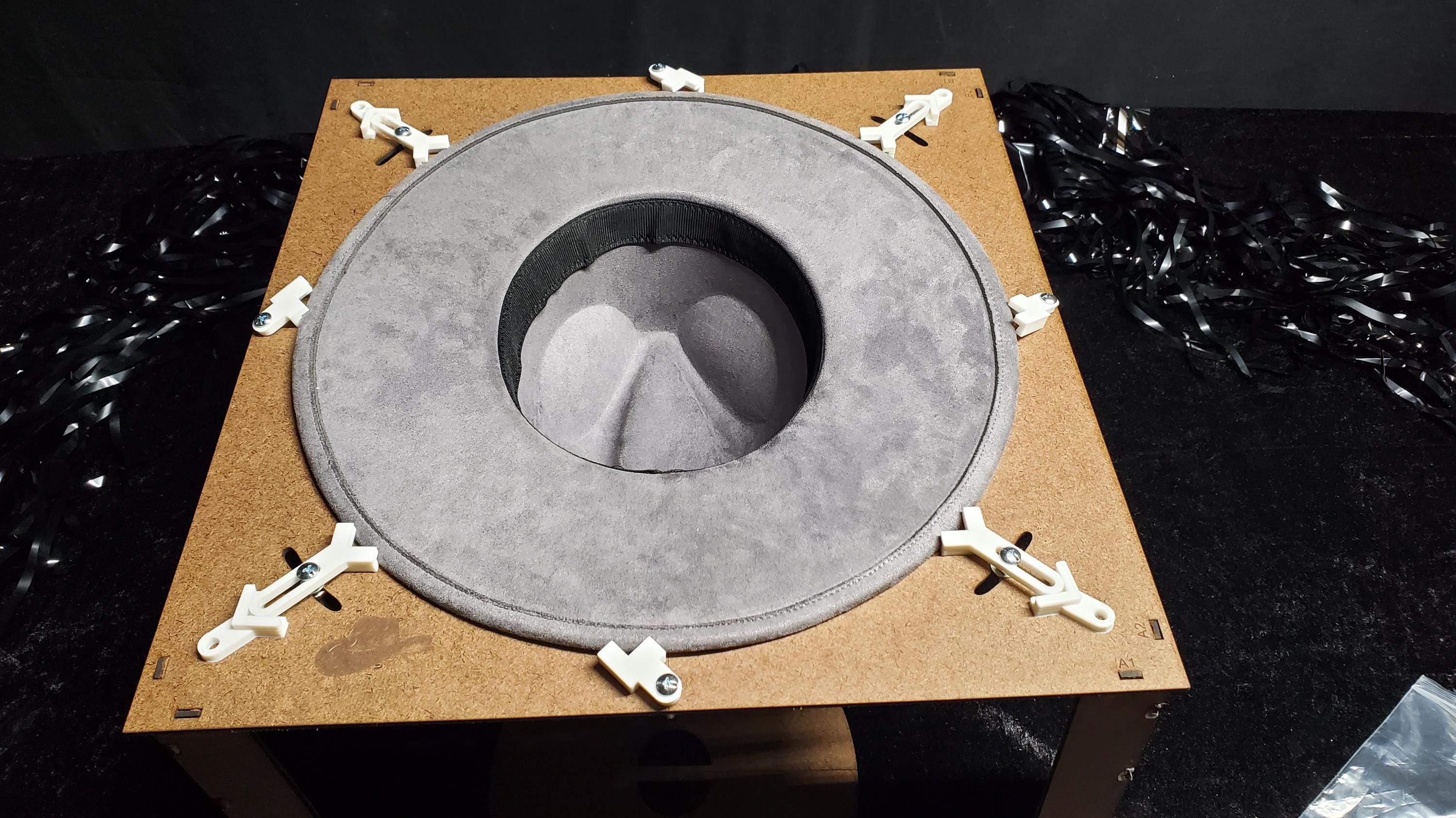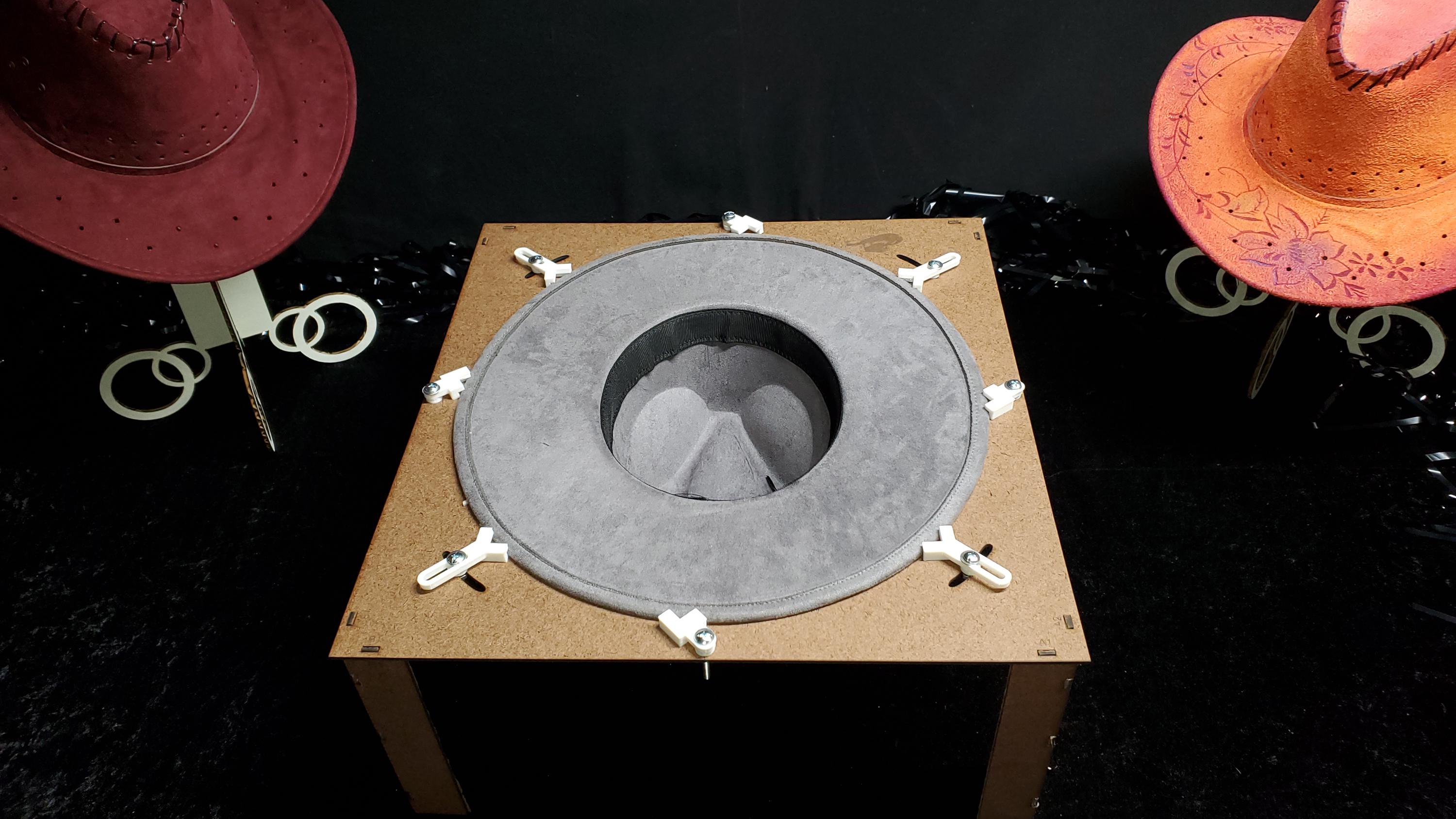 Clips and screws to hold the hat brim flat during engraving.