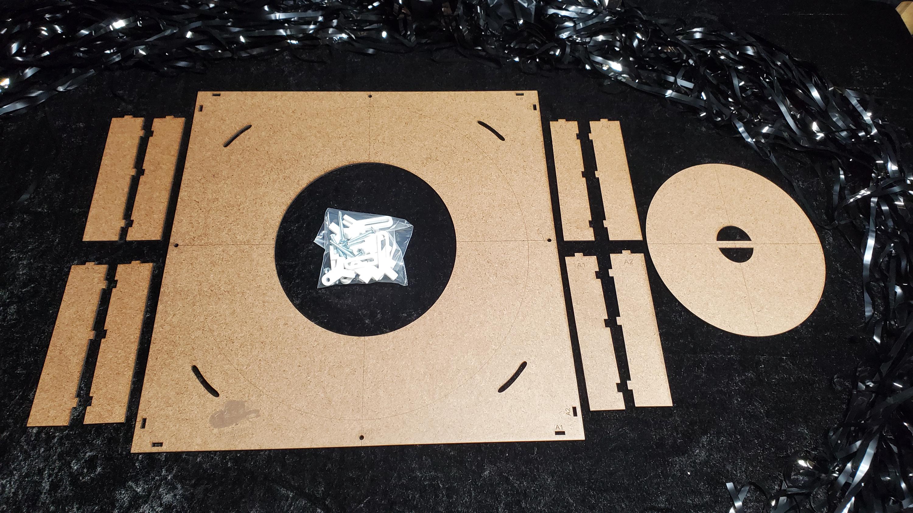 Pre-cut Hat Jig Template parts (base + legs/risers) made from Eucaboard labeled for easy alignment.